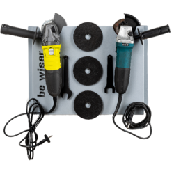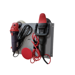Wieszak przeznaczony do składowania dwóch urządzeń polerskich lub szlifierskich. Wycięcie w górnej partii dodatkowo zabezpieczone jest gumowaną nakładką ochronną. Haczyki umożliwiają zawieszenie przewodu oraz akcesoriów polerskich a w przypadku szlifierek tarcz roboczych.