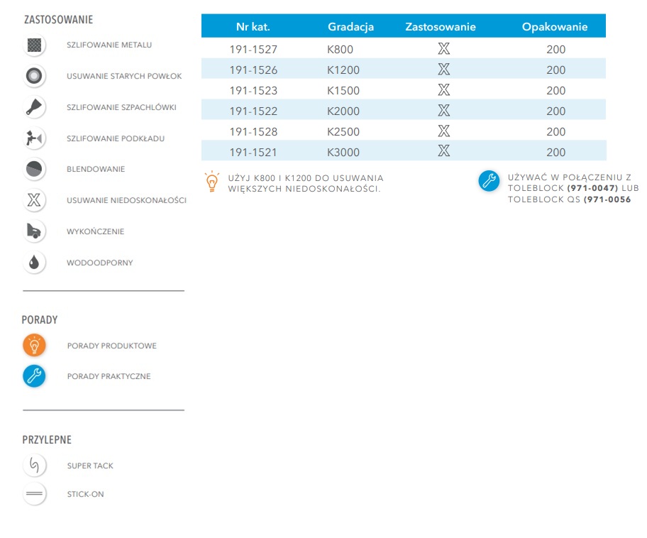 WPF Next Gen to idealny papier ścierny do skutecznego ręcznego szlifowania na mokro i na sucho na wielu powierzchniach. Jest bardzo elastyczny, w pełni wodoodporny i ma doskonałą przyczepność do ziarna. Wyprodukowana w nowej technologii powlekania powierzchnia ścierna nie zatyka się łatwo, dzięki czemu można szybciej szlifować, a materiał ścierny trwa dłużej. Szczególnie zalecany do renowacji samochodowych ze względu na jednolite wykończenie powierzchni. Drobniejsze ziarna są optymalne dla świeżych, czystych powłok i ułatwiają polerowanie.