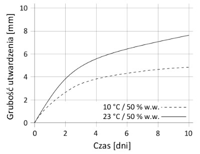 Sikaflex®-529 Evolution utwardza się w reakcji z wilgocią atmosferyczną. W niskich temperaturach zawartość wody w powietrzu jest generalnie niższa i proces utwardzania przebiega nieco wolniej (patrz wykres).