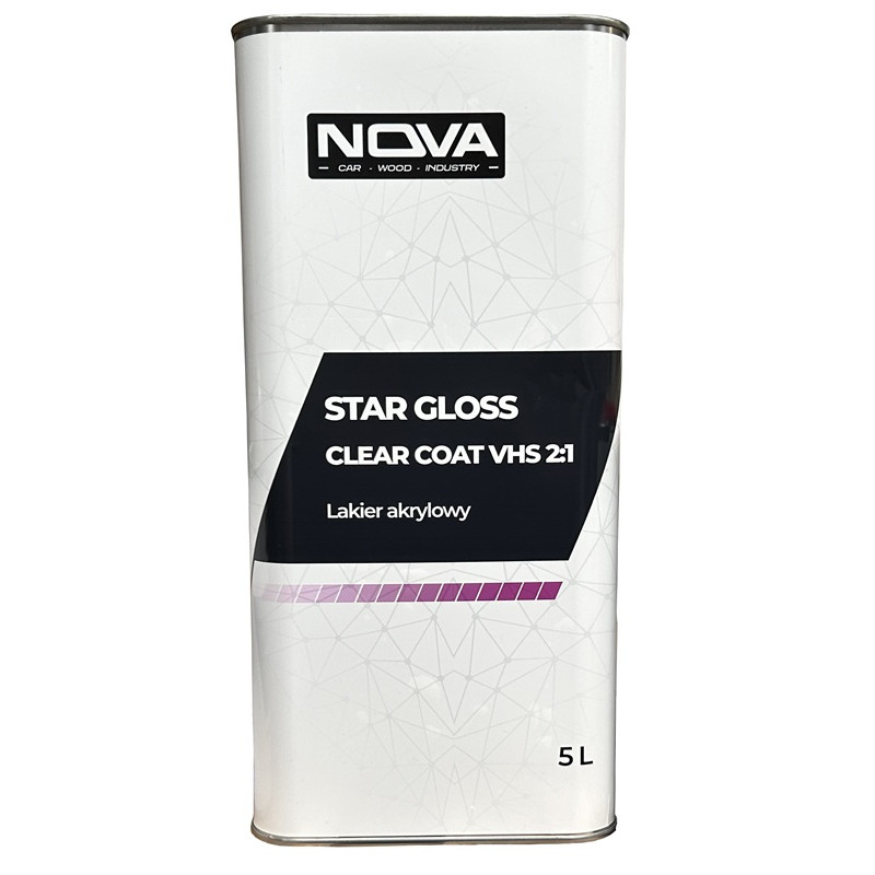 NOVA STAR GLOSS CLEAR COAT VHS 2:1 to wysokiej jakości bezbarwny lakier akrylowy przeznaczony do lakierowania natryskowego. Lakier odznacza się niską zawartością LZO oraz czasem schnięcia (ok 3h w 20°C). Lakier przeznaczony do prac miejscowych jak i całych przelakierowań pojazdów.